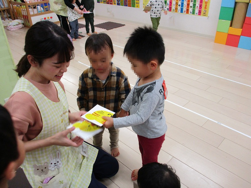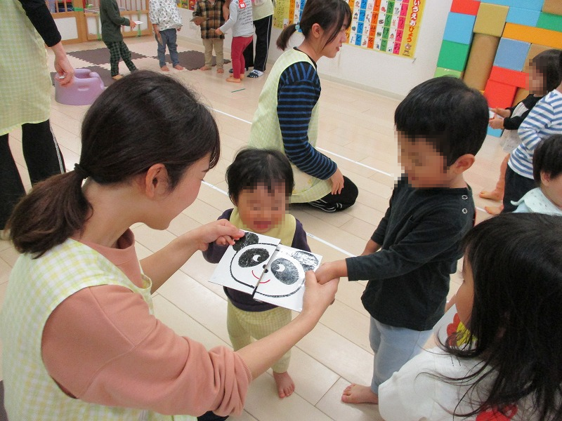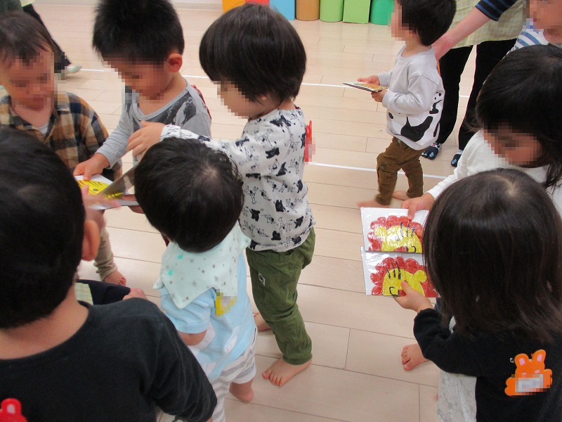 この日の午後の設定保育は「絵合わせ」をしました。子供たちを2チームに分けて動物のお顔が半分ずつのカードを渡して、同じ動物のカードを持っているお友達を探します(^-^)。