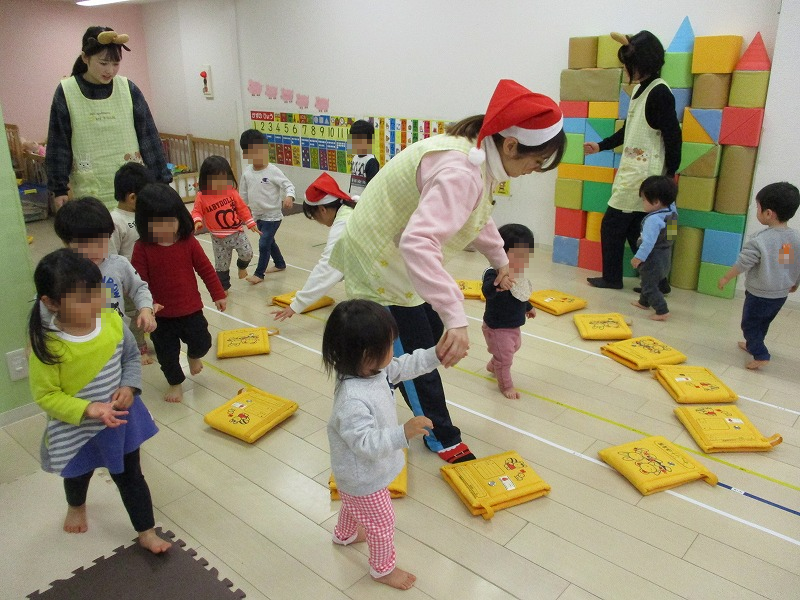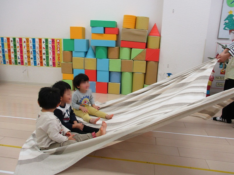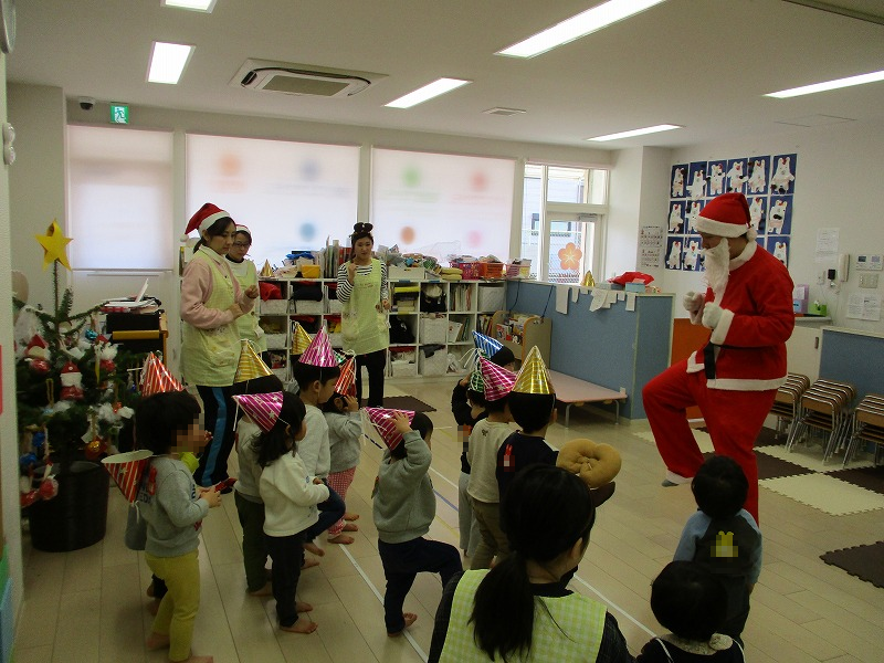 サンタさんが帰った後は、座布団取りゲームをしたり魔法の絨毯に乗ったりして遊びました。この日の給食はクリスマスランチ、おやつはもちろんクリスマスケーキ、牛乳で乾杯です「メリークリスマス!」(^0^)/
