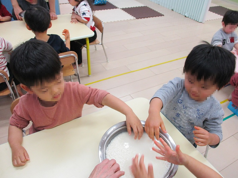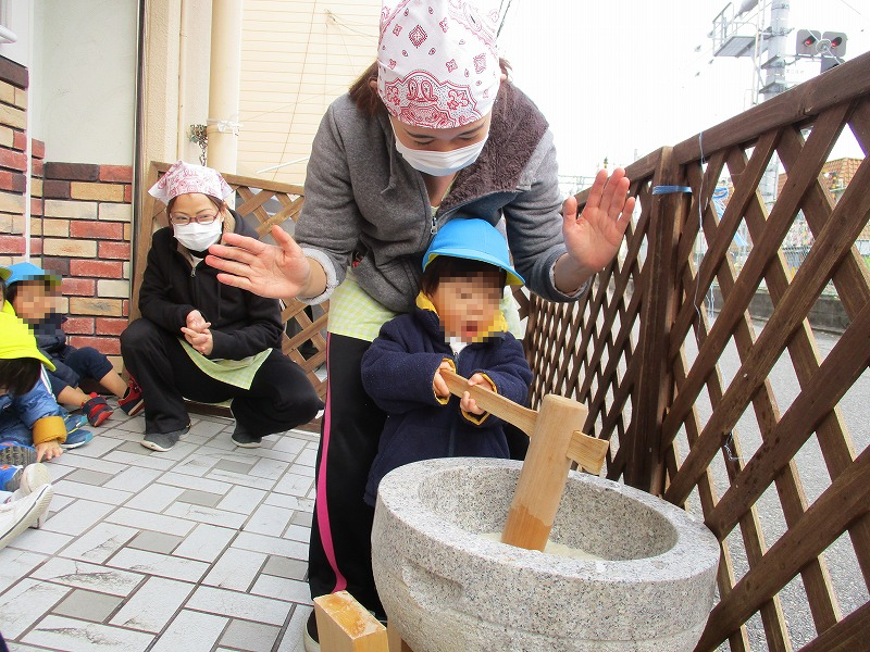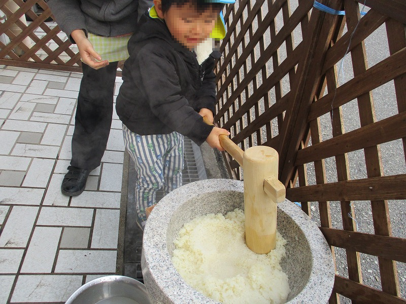 「ぺったん、ぺったんー♪」お米の粒が壊れてお餅の形になっていきます(^-^)。みんなで協力して「はぁー、ぺったん、ぺったん♪」(^-^)/