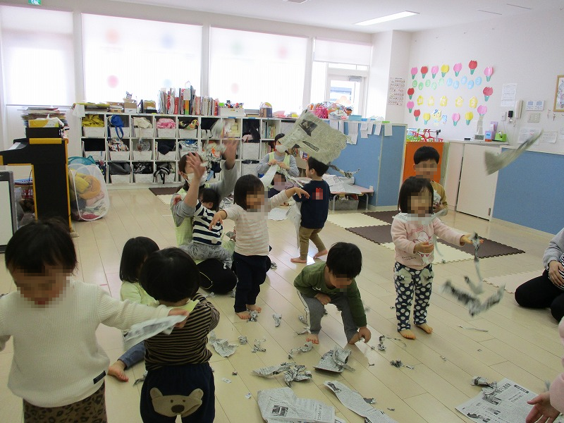 今年の在園児、赤組のお兄ちゃんお姉ちゃんはつられ泣きもせずに頑張っています。そこで赤組さんのストレス発散〈新聞紙遊び〉です。新聞紙をちぎったり、丸めたり、「ビリビリ・クシャクシャ〜」お家ではなかなか出来ない遊びで楽しそう♪