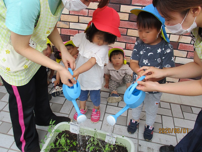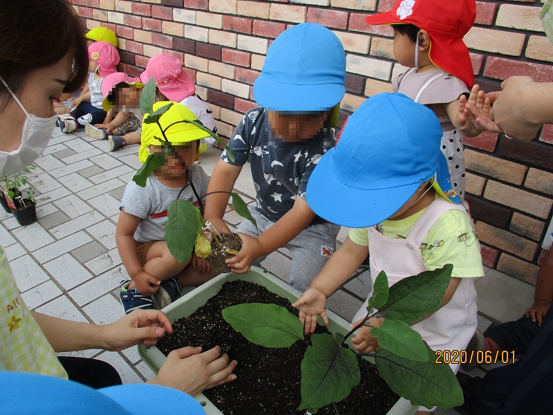 午後は5月にする予定だった茄子とトマトの栽培を始めました。プランターに土を入れて〜、ナエを植えて〜♪土をかけて〜、お水を上げます(^-^)。