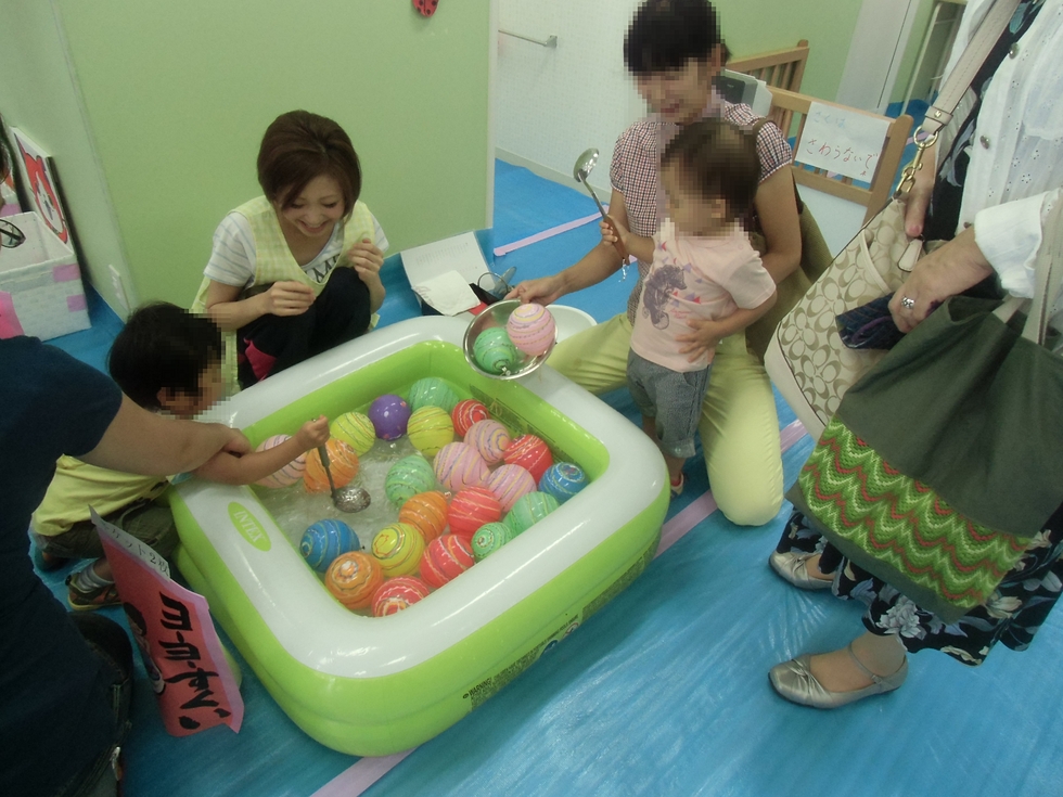 「ヨーヨーすくい」はお玉でヨーヨーをすくいます。バランスとるのがムズカシイよね(笑)。(右下写真)