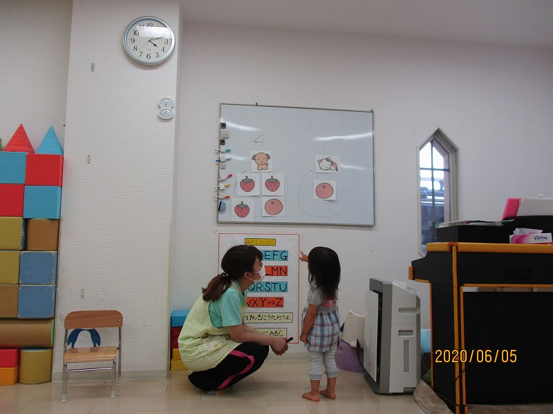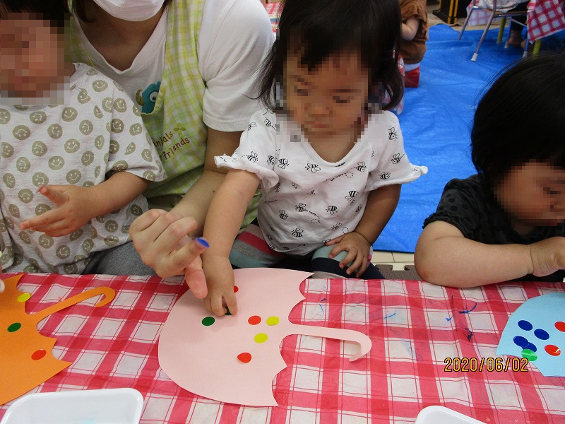 下の写真は「数字遊び」と「絵画工作」の時間、新入園児さんはシール貼りに集中しています(^-^)。