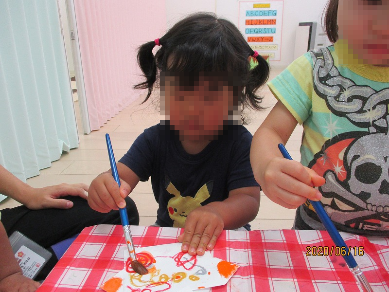 下の写真は今週の工作絵画「はじき絵」をしました。クレヨンで描いた絵の上から絵具で色を塗ります。真剣な表情で頑張っています(^-^)。