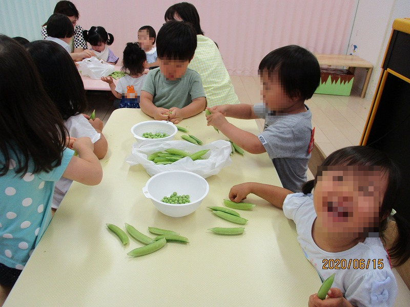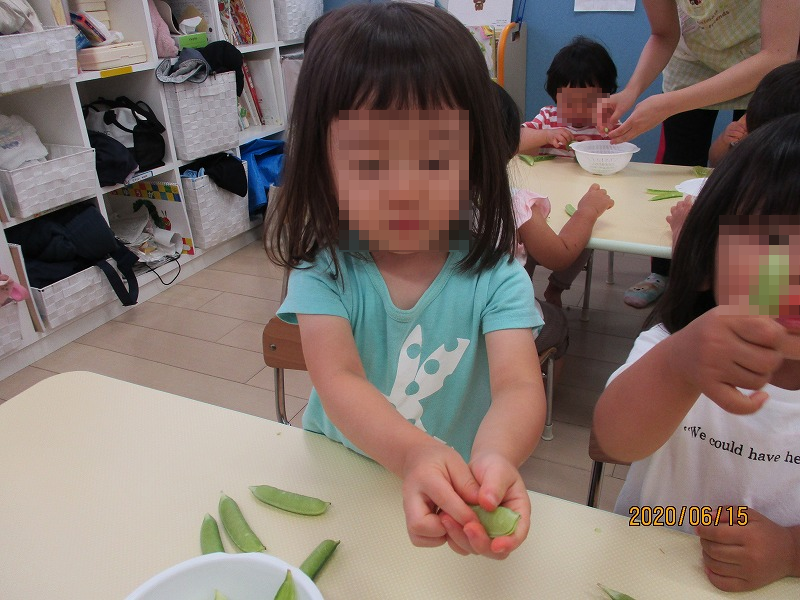 今週は食育「えんどう豆のさやむき」をしました。子ども達、楽しそうにかつ真剣に取り組んでいます(^-^)。