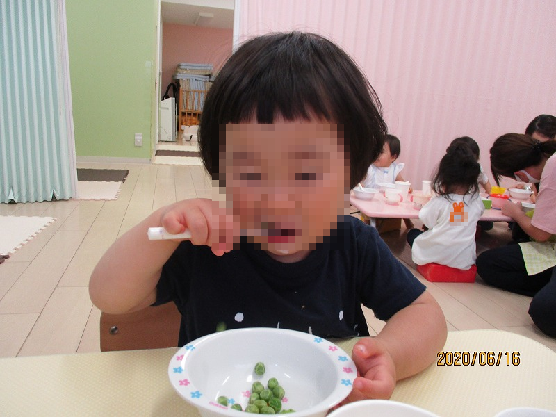 この日のおやつはゼリーにもう1品。「えんどう豆の塩バター炒め」。茹でたお豆をバターで炒めお塩で軽く味付けます。「おいしい〜♪」「ヤミー!♪(英語)」子ども達、満足そうな笑顔でした(^-^)。