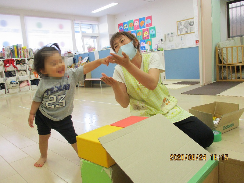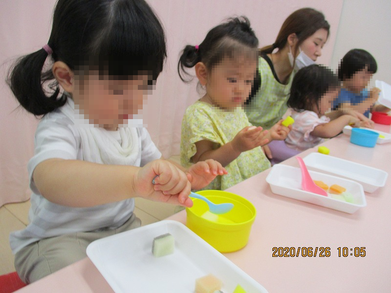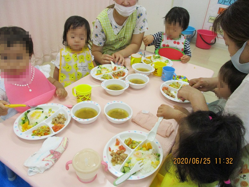 写真は遠足から帰って来てからの新入園児(1才児)の様子です。楽しそうに設定保育に参加したり、スプーン遊びでは真剣に取り組めています。給食も泣かずにモリモリ(笑)。