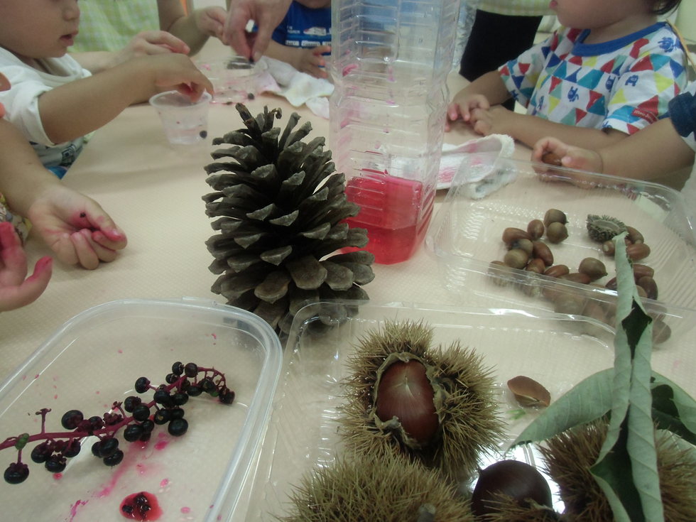 (どんぐり)(くり)(まつぼっくり)(ヨウシュヤマゴボウ)、子天使ちゃん達は興味深々(^-^)。