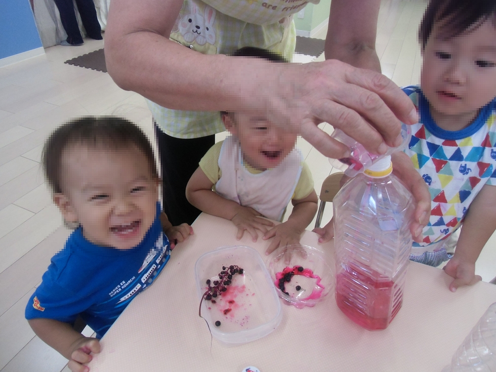 ヨウシュヤマゴボウの実に水を加えてすり潰すと、ずごくキレイな赤紫の染料がとれます。さっそく作ってみました(右下写真)。子天使ちゃん達大喜びです(^0^)。