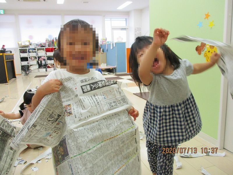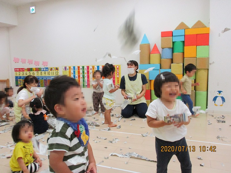 ウェリナの子天使ちゃん達はたくさんの経験をして楽しみしっかり学びました。写真は、雨の日のストレス発散に最適、新聞紙遊びです(^-^)。ビリビリ破って散らかしたり、丸めて先生を狙ったり、頭からすっぽり被ったり〜♪お家ではなかなかできないもんねー(^-^)/。