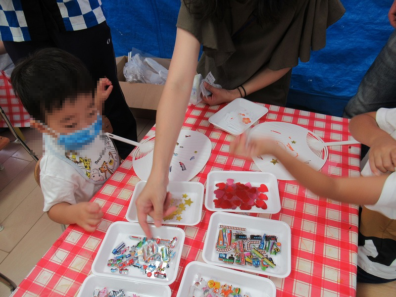 下の写真は「手作りうちわコーナー」と「知育遊びコーナー」です。