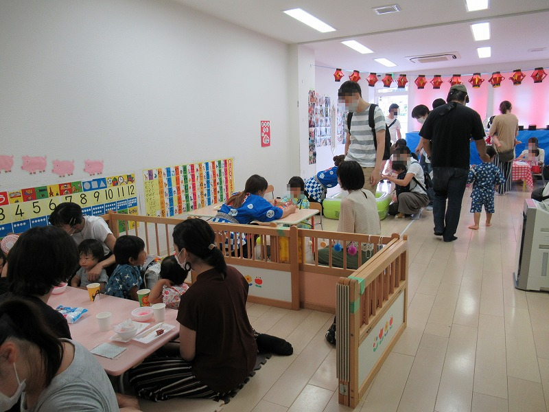 今年は「卒園児の参加」や「近隣未就学児の参加」をご遠慮いただいて(毎年の卒園児の参加は職員一同、非常に楽しみにしていたんですが・・)、在園児と保護者と職員だけの規模縮小での夏祭りになりました。