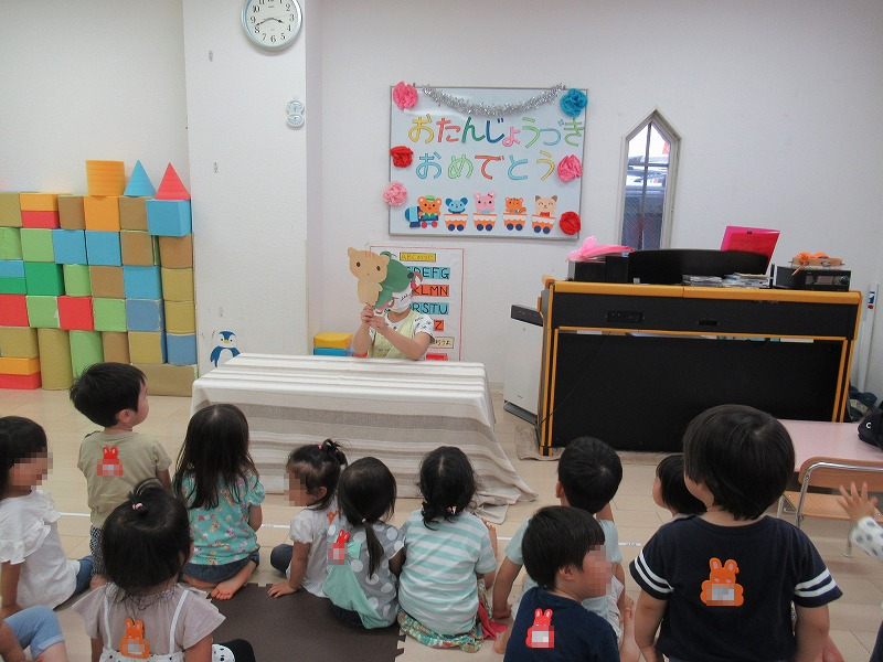 恒例の先生たちによる出し物のあと、先生からバースディカード、皆からはお歌のプレゼントをもらったら、給食師さんの手作りイチゴのケーキ。牛乳でカンパーイ♪