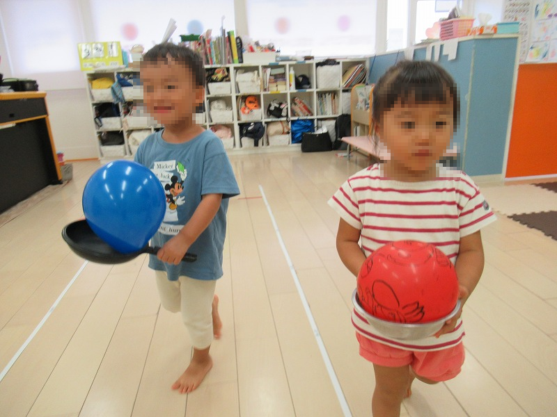 右下の写真はフライパンを使っての風船運び競争、楽しそうに運んでいます。