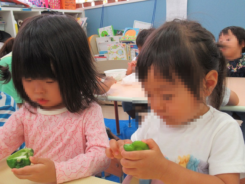 左下の写真は食育・ピーマンの種取り。この日の給食にはもちろんピーマンが。いつもはピーマンが苦手な子天使ちゃんもこの日の給食のピーマンはきれいに食べていましたよ(^-^)/。