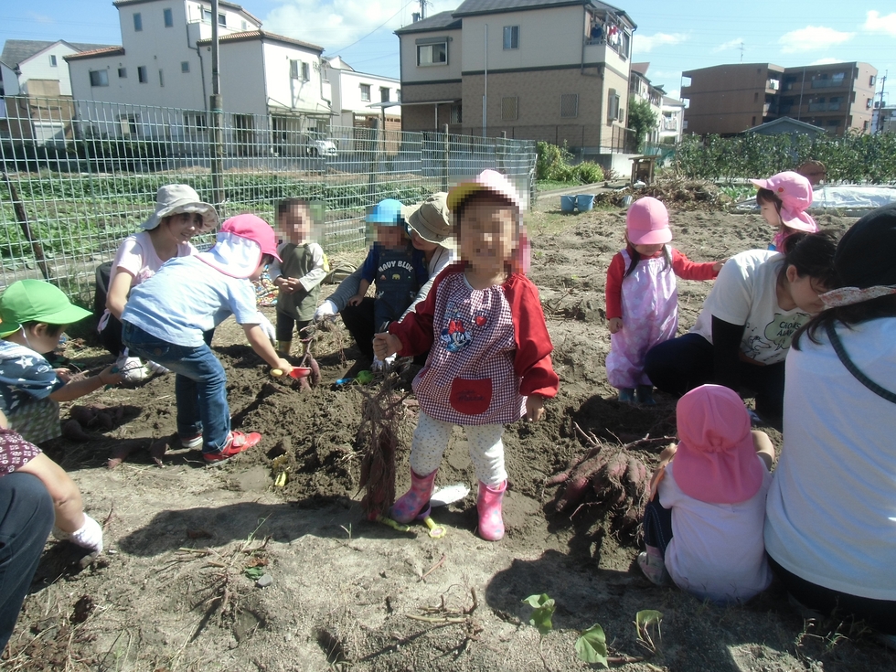 初めてのおいも掘り、沢山のおいもをゲット!すごく得意げな笑顔です。(左下写真)