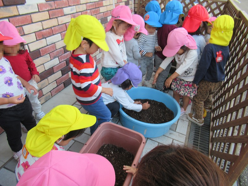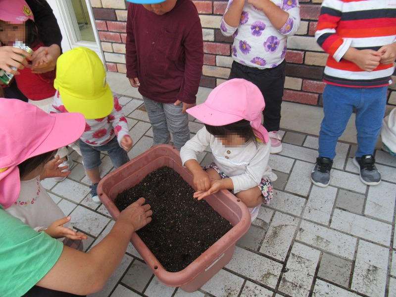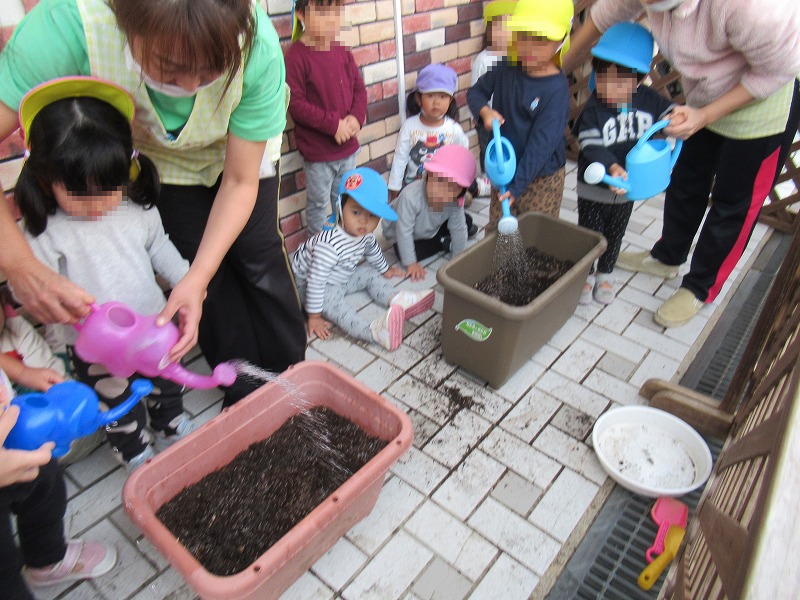 肥料土をみんなでプランターに移して♪土をなじませたら、指先で種まき用の小さな穴をあけて〜♪カブの種を穴にまきます。土をやさしくかぶせたら♪ジョウロでお水を、「大きくなぁれ♪美味しくなぁれ♪」子天使ちゃん達のお手ては土で真っ黒け(^o^)。立派なカブが育ちますように(^-^)。