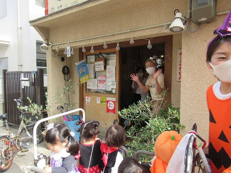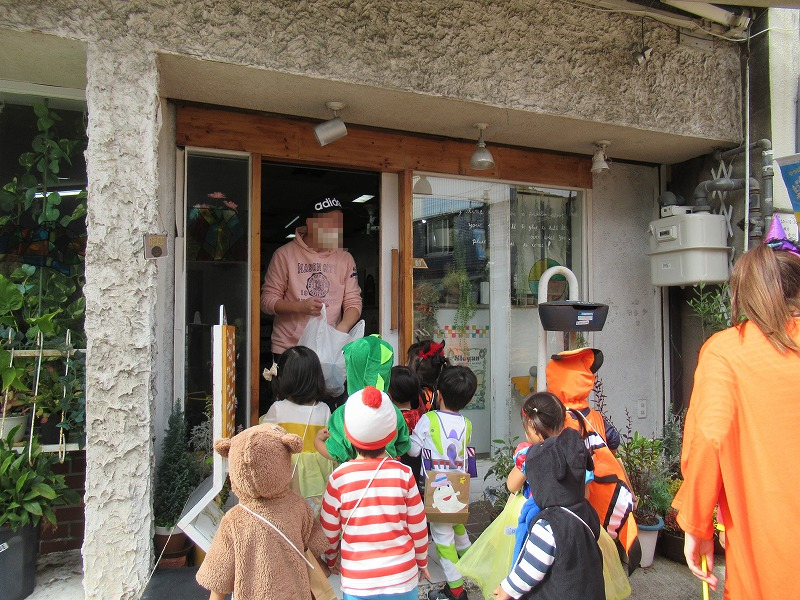 その時[神戸屋金物店]さんもお菓子を持って店先に出てきてくれました。「Trick or Treat!」もちろん子悪魔ちゃん達に遠慮などありません(笑)。