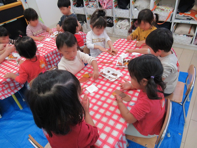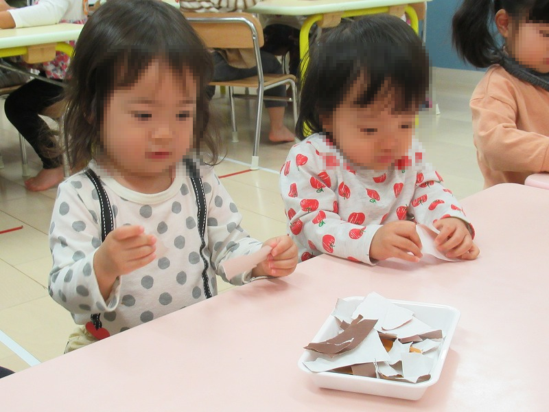 先生からミノムシ(オオミノガの幼虫)の話を聞いてパネルを見たら♪色折り紙をちぎってービリビリ♪糊でミノをはり合わせてーヌリヌリ♪お顔に目と口のシールを貼ったらーペタペタ♪個性豊かな可愛いミノムシさんがたくさん(^-^)/。