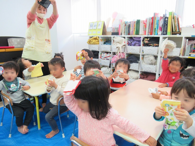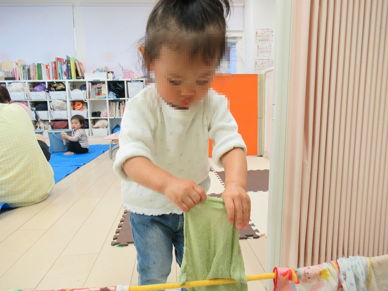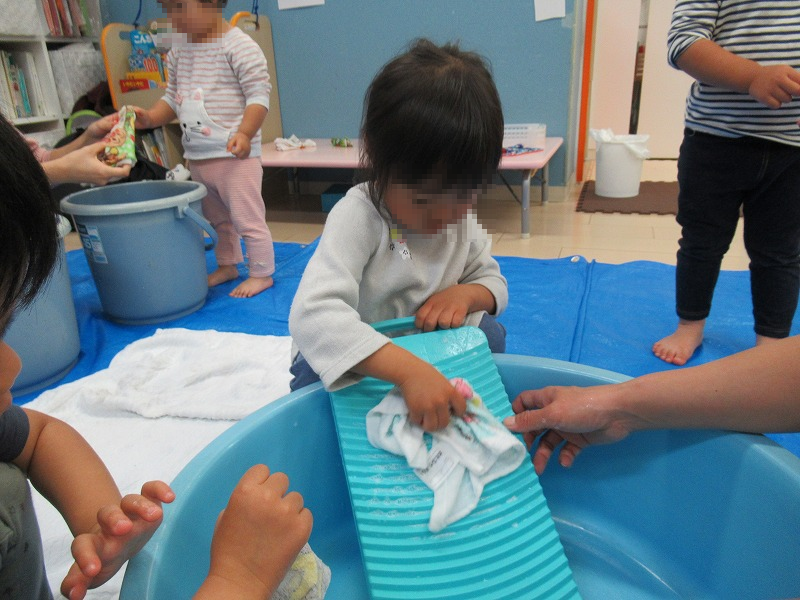この日の設定保育は洗濯ごっこ。各児自分のお手拭きタオルを洗濯します。