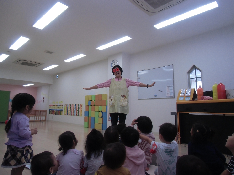 左下の写真は今日の設定保育。T先生がトンボのメガネをかけて「トンボのメガネ」を歌っています(^0^)。