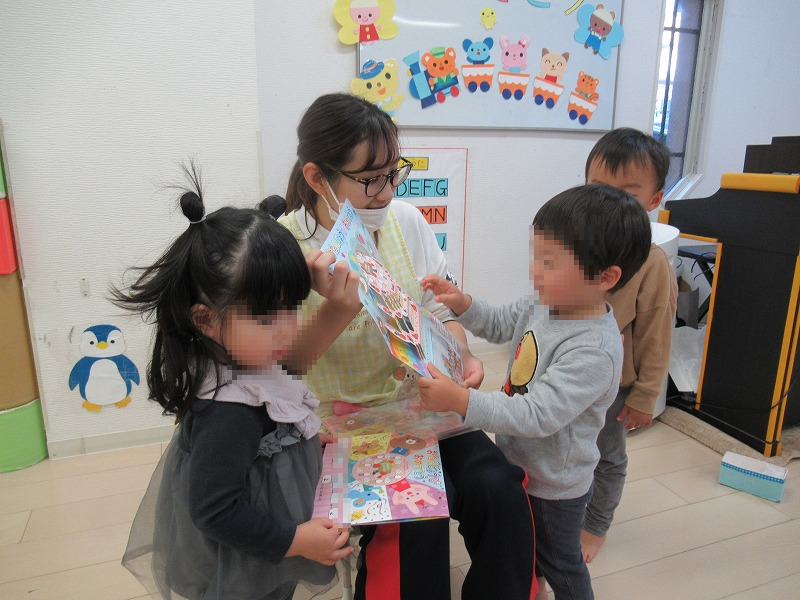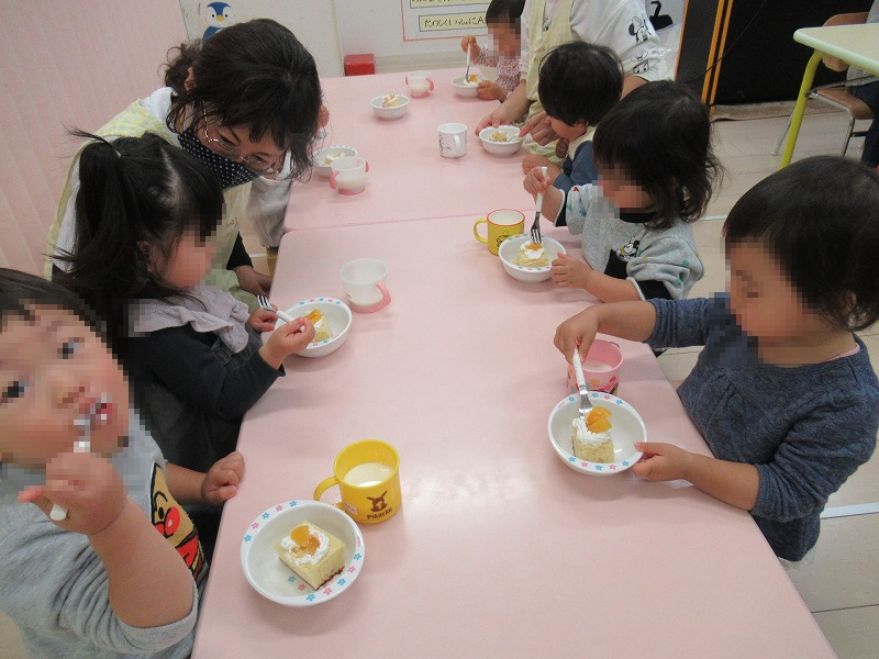 11月はHくん満3才、Aさん満2才、Sくん満2才のお誕生月。恒例の先生たちの出し物が終わったら、先生からバースディカードを受け取って〜、みんなからお歌のプレゼント♪給食師さんの手作りフルーツケーキ、牛乳でカンパーイ!