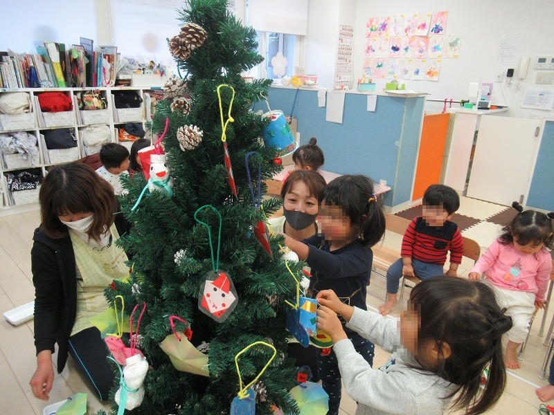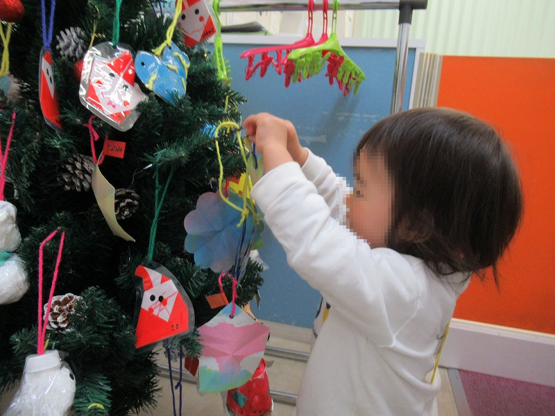 自分たちで頑張って作ったオーナメント、いよいよツリーに飾り付けます。