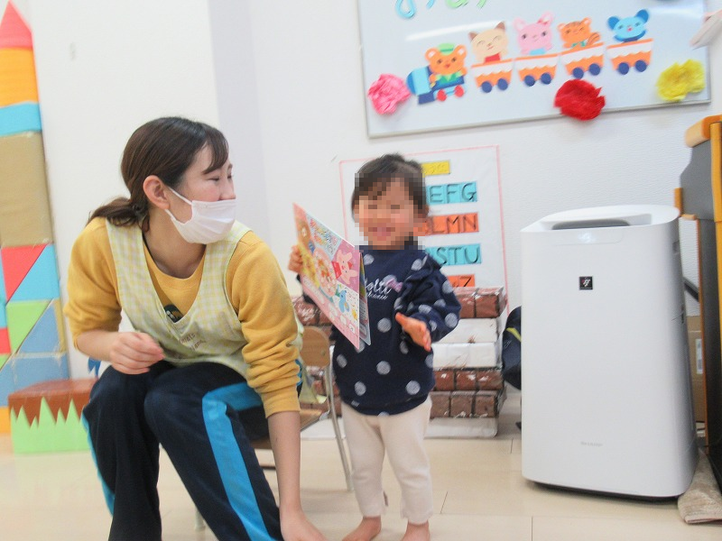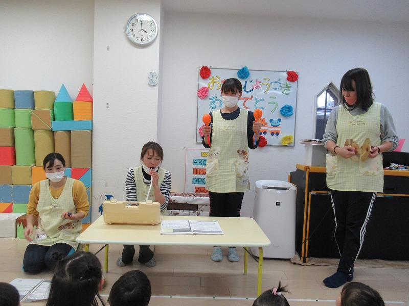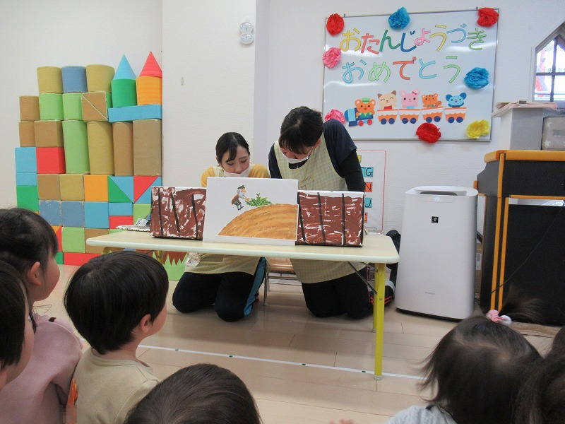 今月はSさん、満2才のお誕生月。恒例の先生による出し物の後、先生からバースディカードのプレゼント。みんなでお歌のプレゼント♪給食師さんの手作りケーキ、牛乳でカンパーイ!
