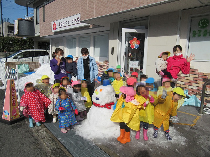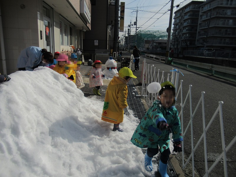 そのうち赤組(2才児クラス)の男子達が雪合戦を始めました♪と、その時、カメラを持ってる園長にも雪玉が飛んできました(左下写真)笑。