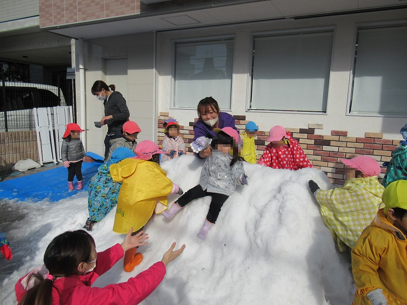 初めて雪に触れる子天使ちゃん達(^-^)。「○△※□×◇〜!」言葉にならない叫びをあげて興奮状態!(笑)雪山によじ登ったり、滑り台にして滑ったり、雪を食べようとしたり(これこれ、食べてはいけませんよ・笑)。
