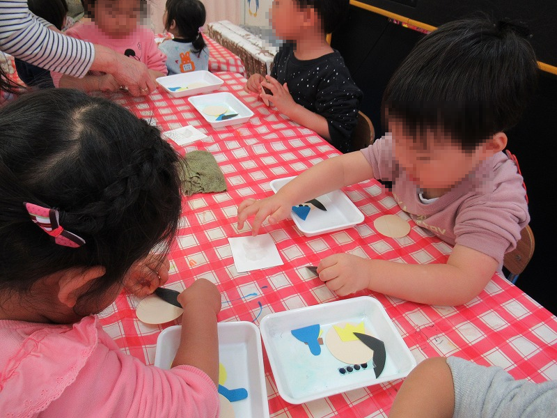 指に糊を付けてペタペタ♪子ども達の表情は真剣です、ヌリヌリ〜♪