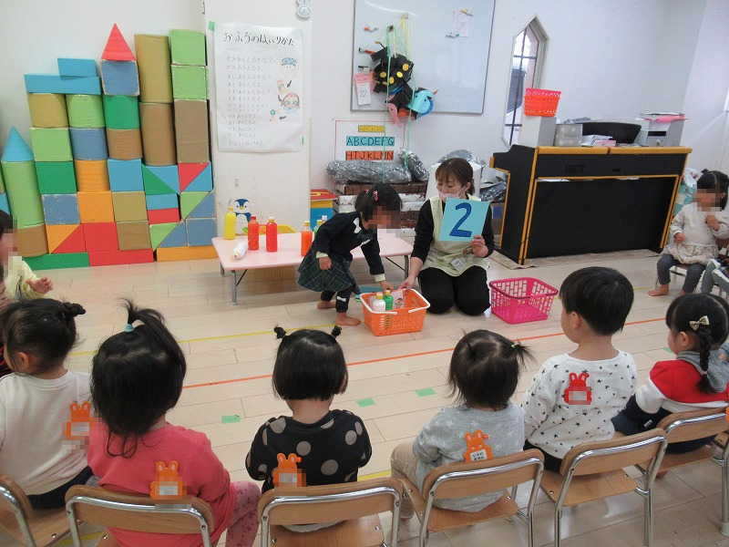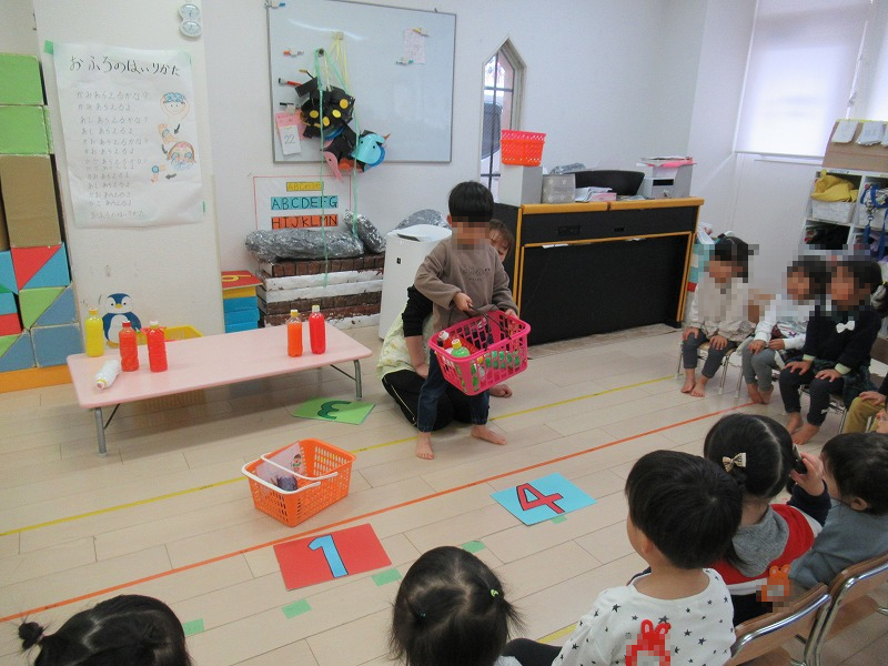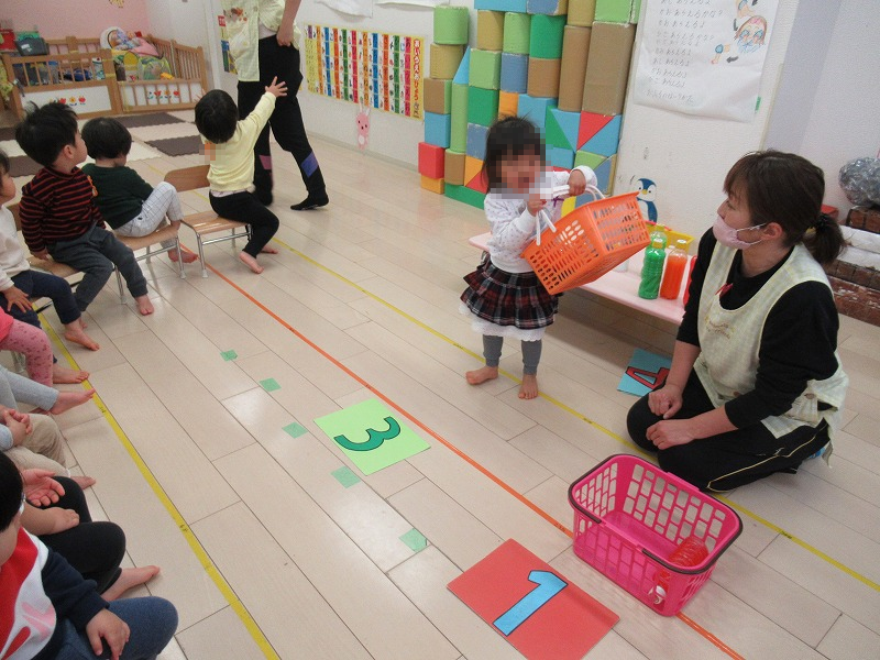 数字が書かれた2枚のカードを引いて、カードに書かれた数字の数だけのペットボトルをそれぞれの買い物かごに入れます。2つの買い物かごを持ち比べて〜重たいのはどっち?♪