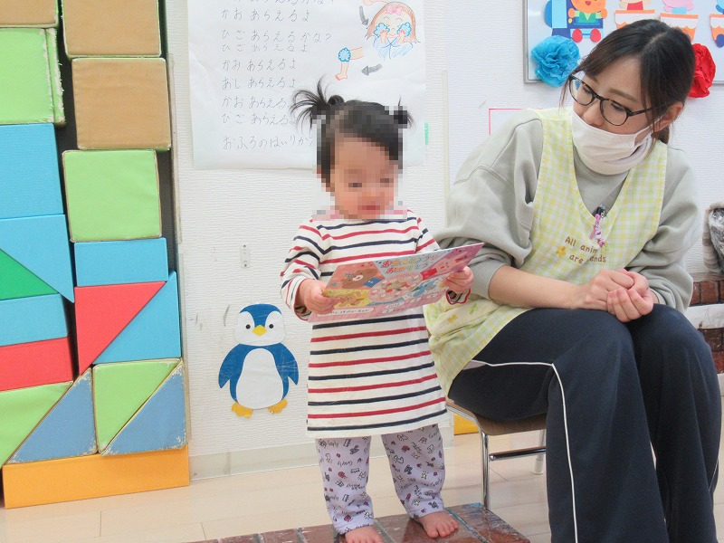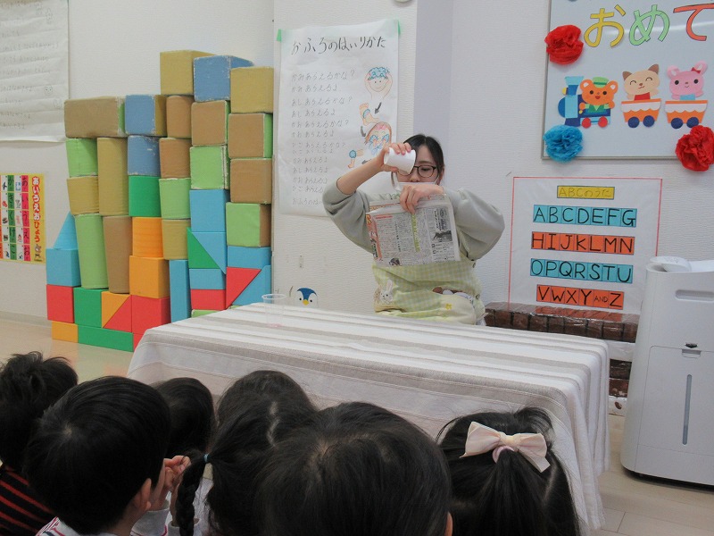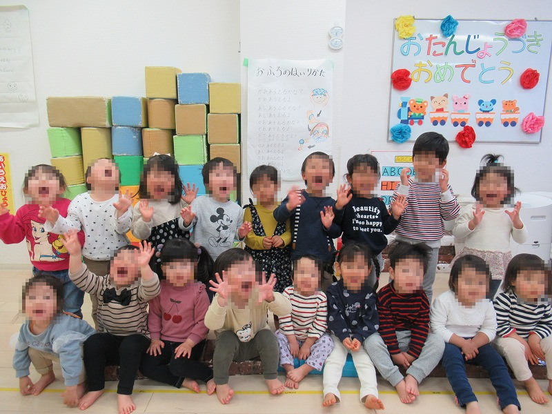 この日はHちゃん満2歳のお誕生月会をしました。恒例の先生たちの出し物を見た後、先生かバースディカードを受け取ったら、みんなでお歌のプレゼント♪手作りケーキと牛乳でカンパーイ!