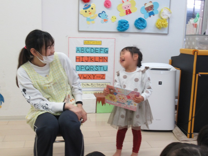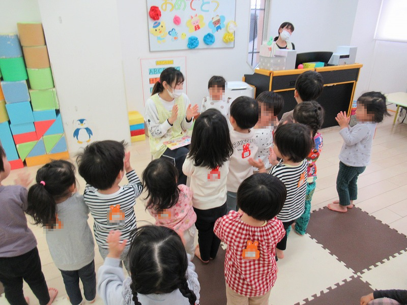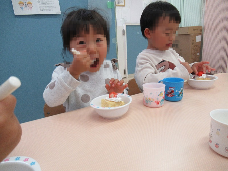 3月はMちゃん満3才のお誕生月。恒例の先生たちの出し物で楽しんだ後は、先生からのバースデーカードのプレゼント。みんなでお歌のプレゼント。手作りイチゴのショートケーキ、牛乳でカンパーイ♪