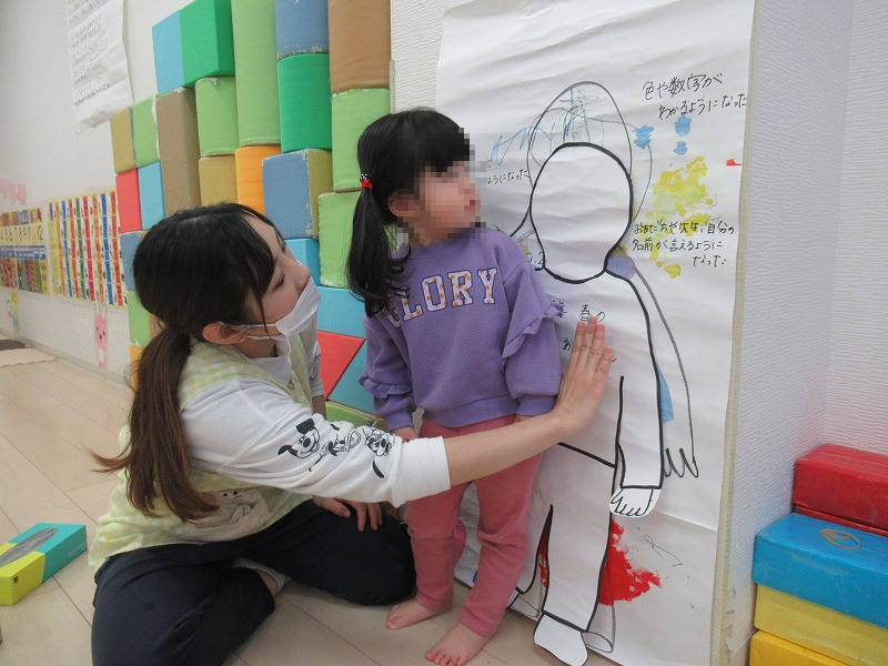 去年の4月の工作の時間に描いておいた自分自身の人型と今月の工作に時間に描いた自分自身の人型を比べます。どれぐらい大きく成長したのかな〜(^o^)