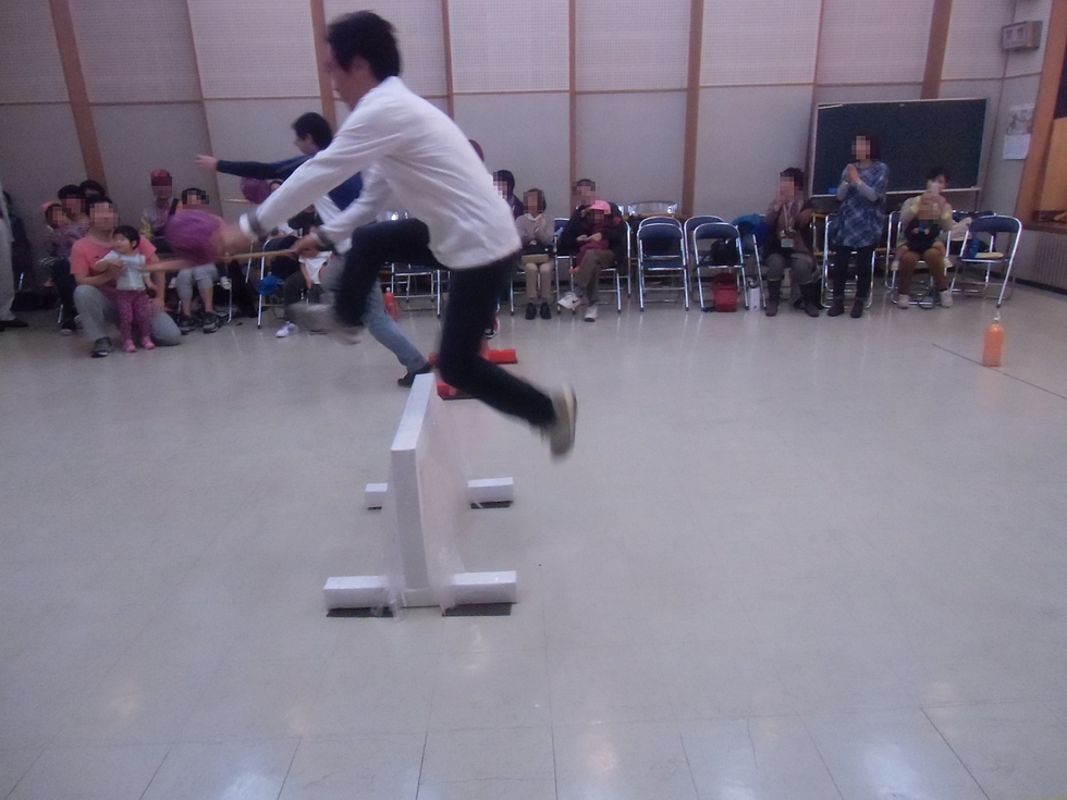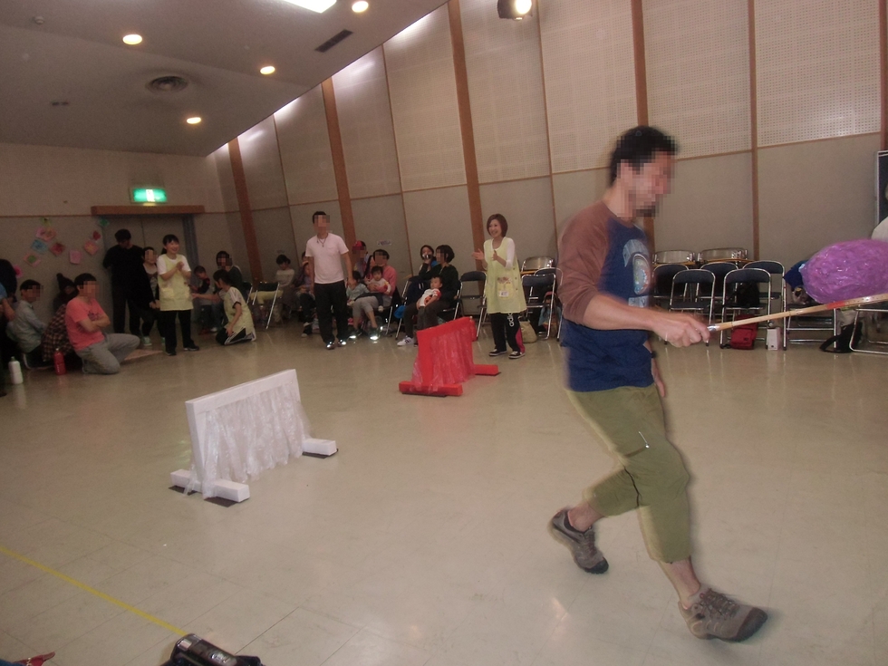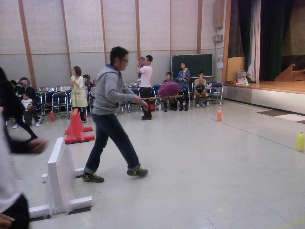 保護者競技の「大きなお芋を運ぼう」です。バトミントンラケットに大きなお芋を乗せて運びます。バランスをくずしてお芋を落とさないように(^-^)。この競技も紅白戦です、わが子のためにお父さんお母さん方、大ハッスル!