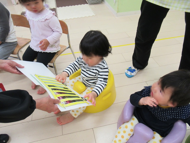 右下の写真は英会話プログラムのときの新入園児、分からなくても興味深々。これでいいんです(^-^)