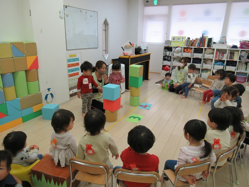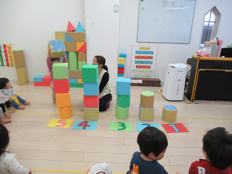 この日は赤組さんの本領発揮、「数字あそび」です。足し算や引き算ではありませんよ。数字の概念を知るんです。今回は数字と高さ、ソフトブロックで遊びます♪