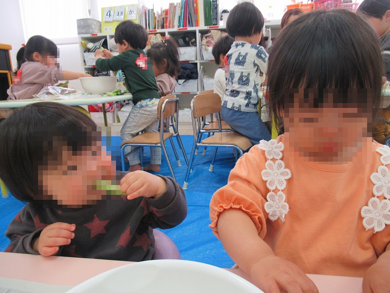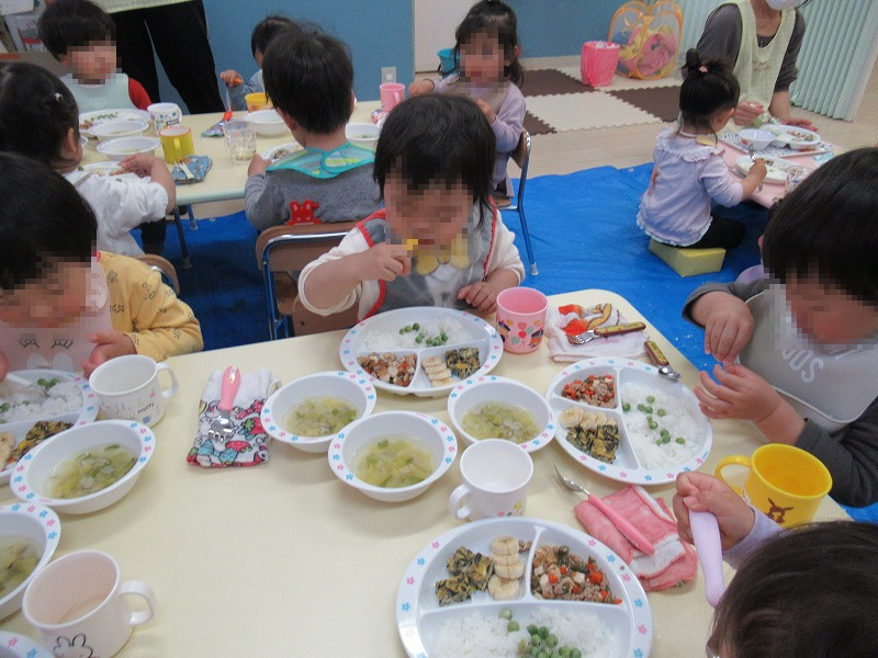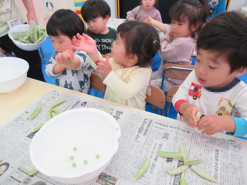 食育もスタートしました。この日はエンドウ豆の皮むき、園児たち楽しそう♪給食は園児たちがむいたエンドウ豆の豆ごはん(^-^)自分たちでむいた豆はやっぱり美味しいねー!