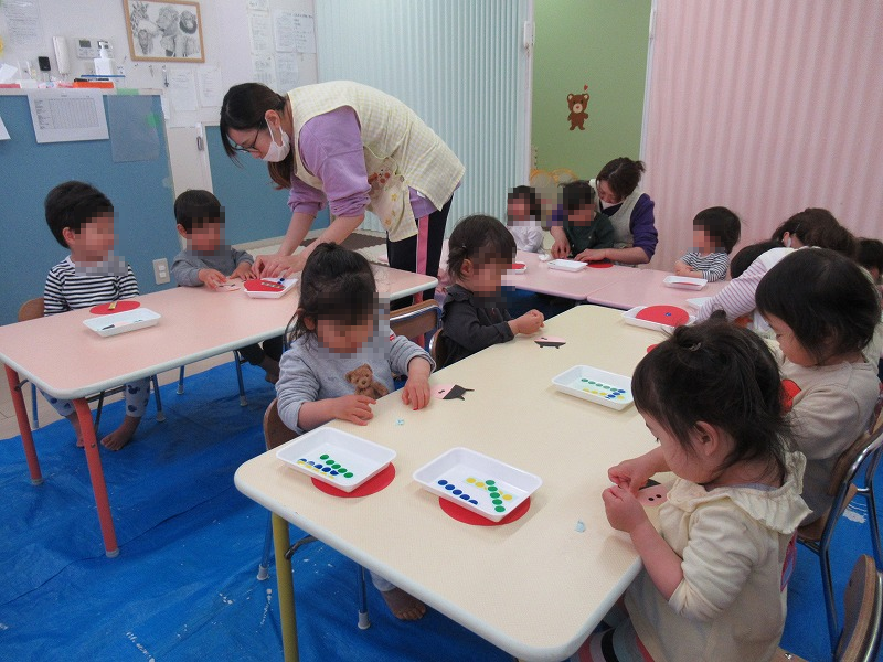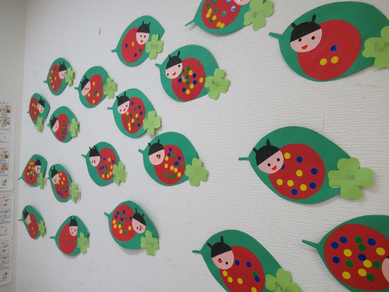 下の写真は工作の時間、シール貼りでテントウ虫を作ります。個性的で可愛いテントウ虫がたくさん完成しました♪