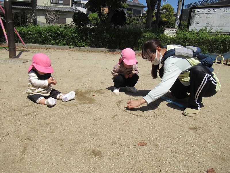 右下の写真は公園で先生が地面にアンパンマンを描いているのを興味津々に見つめる新入園児(^-^)。