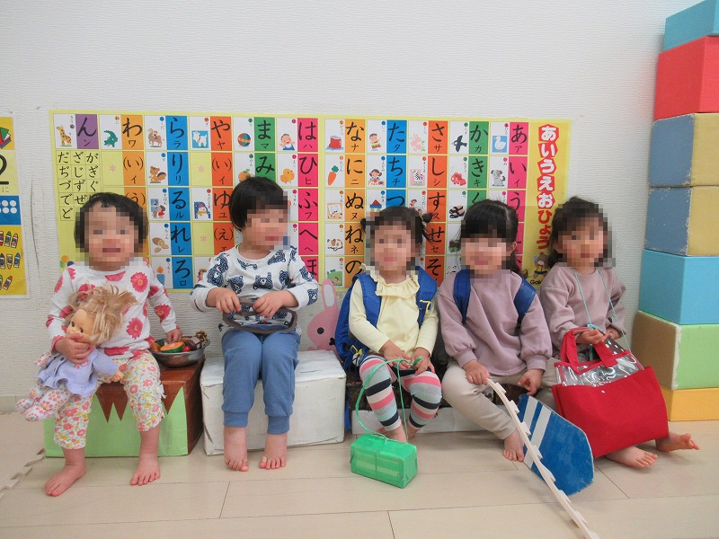 写真は自由遊びの時間、5名の赤組(2才児)女子がごっこ遊びをしています。この写真、先生は介入していないんですよ。気が付けば遊びながら彼女たちが自らこのような態勢に(^-^)。それにしても楽しそう♪