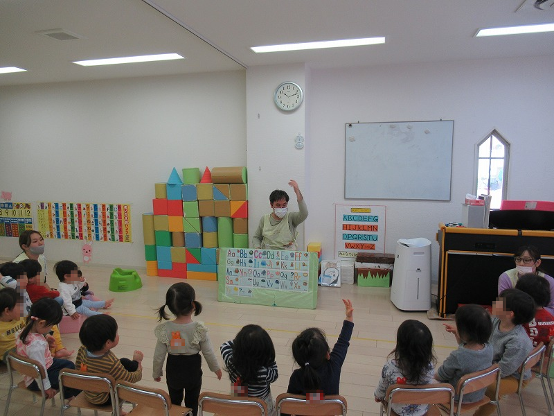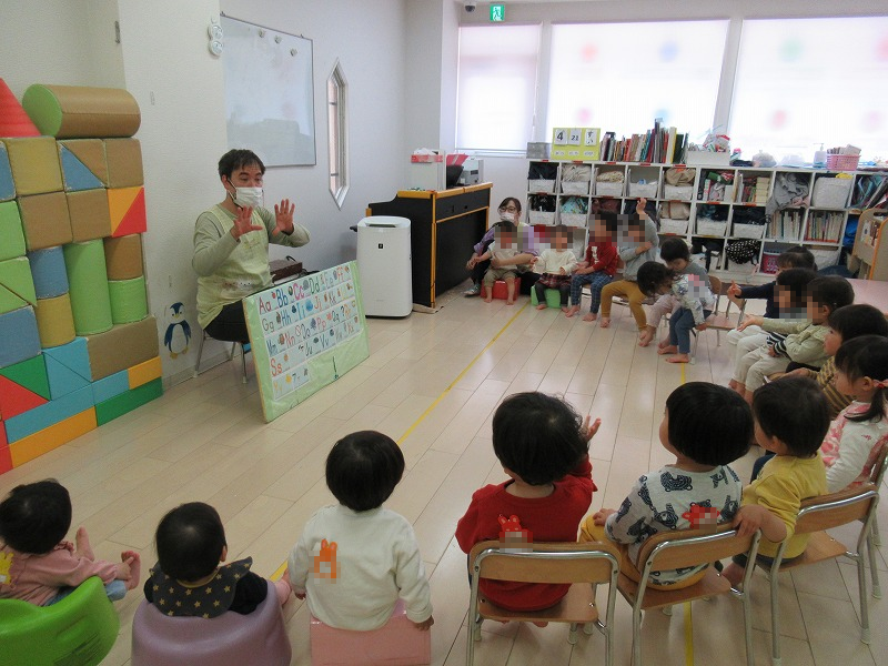 さすがD先生、今年の新入園児(0、1才児)たちも興味津々レッスンに参加できています。意味が分からなくても楽しそうな雰囲気のなかで英語を聞く、これでいいんです(^-^)。