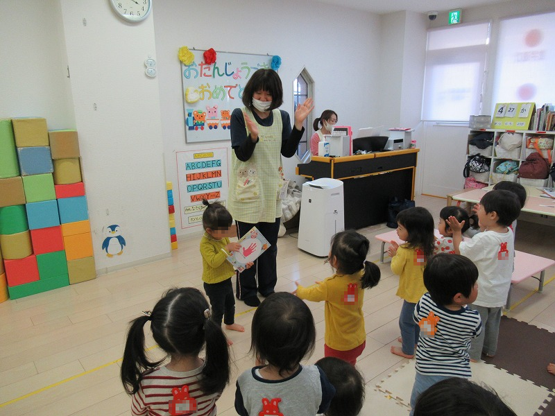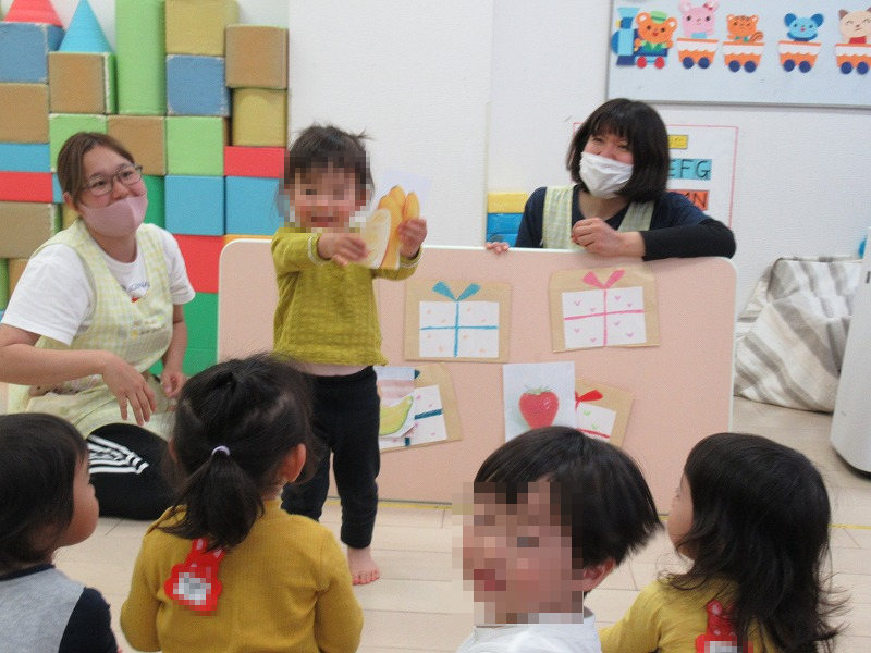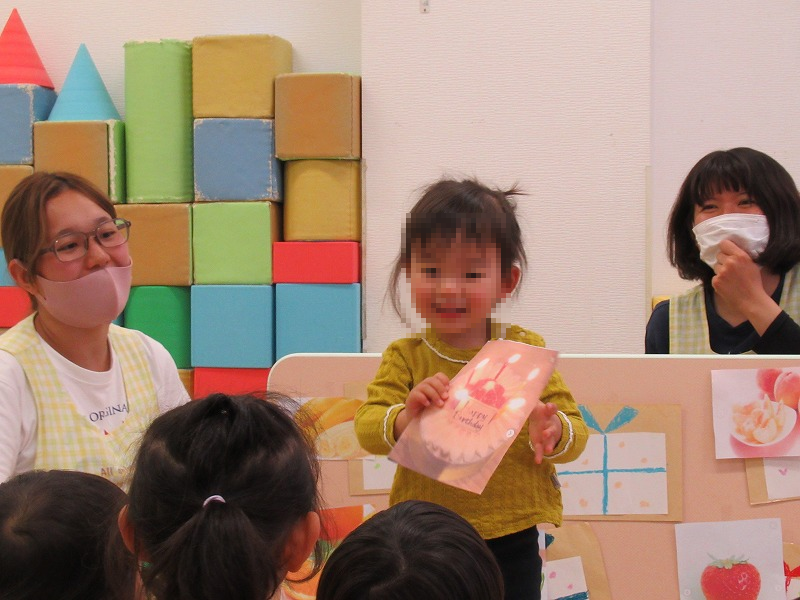 4月はMちゃん、満2才の誕生月。先生たちの出し物が終わると、Mちゃんにバースデーカードのプレゼント。みんなでお歌のプレゼントをしたら、お待ちかねの手作りショートケーキ、牛乳でカンパーイ!