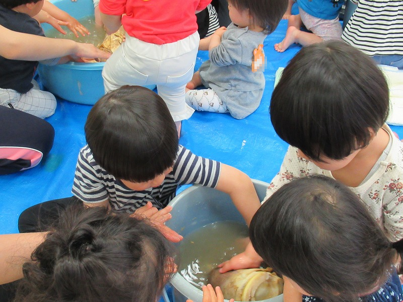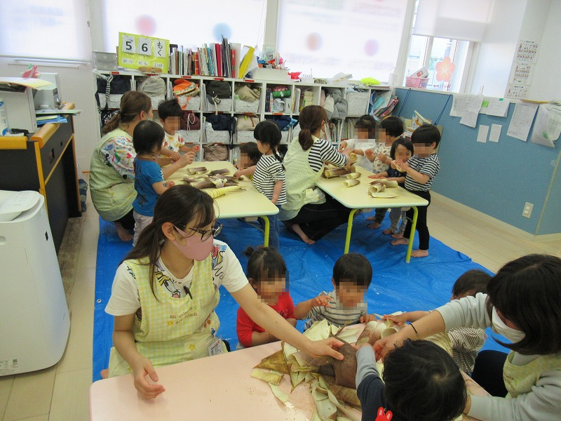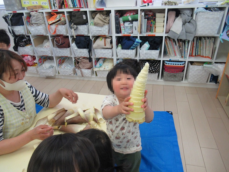 園長の知り合いの方が土のついたままのタケノコを送ってきてくれました(^-^)。まずは土取り・水洗い「シャカシャカ・ゴシゴシ♪」、きれいに土が取れたら〜皮むき開始ぃ「ムキムキ・ムキムキ♪」、子ども達は楽しそう!