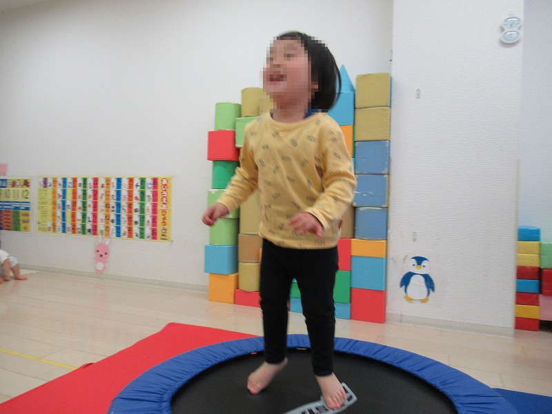 左下写真は朝のお集まり(^-^)。右下写真は室内体育のトランポリン。
