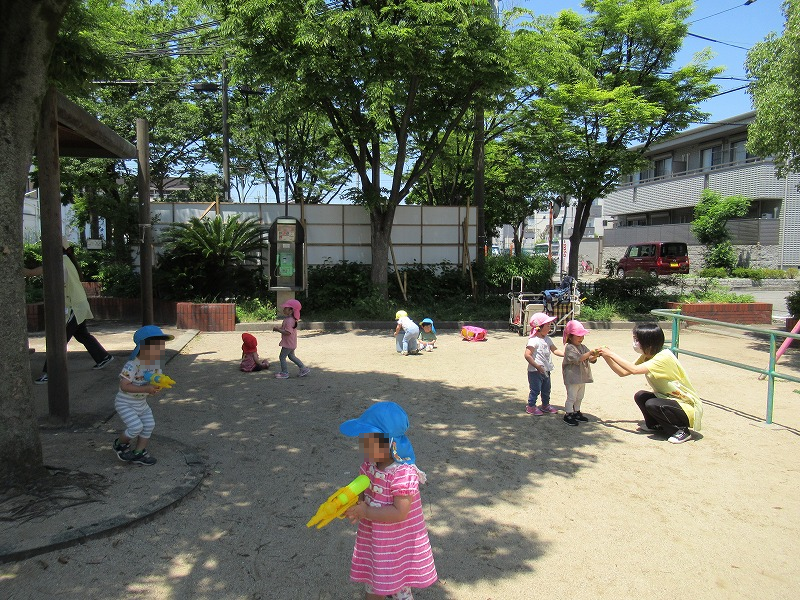 この日は真夏日、赤組(2才児)さんは初めての水鉄砲遊びが気に入ったみたい(^-^)。