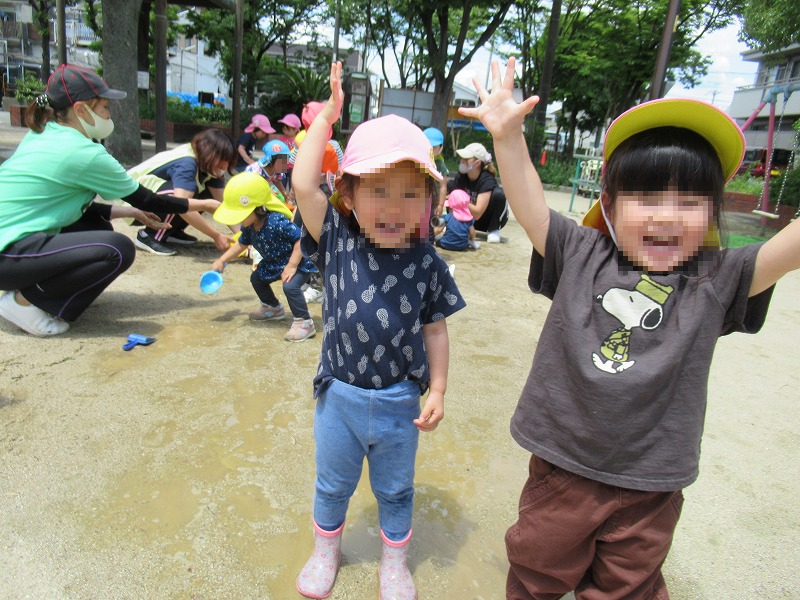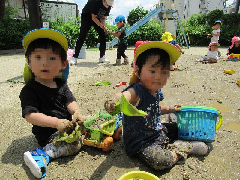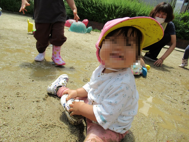 この日は、梅雨の定番遊び「泥んこ遊び」をしました。最近は「泥んこ遊び」をしない園もあると聞きましたが・・