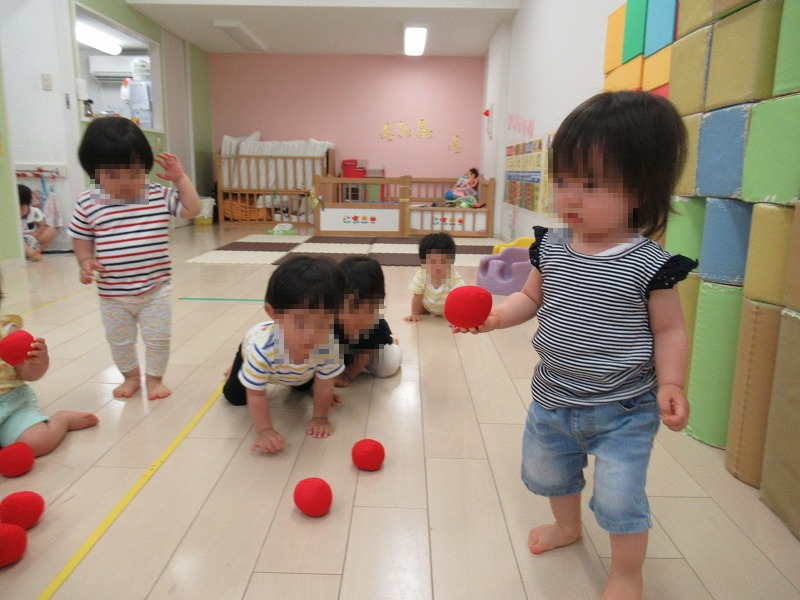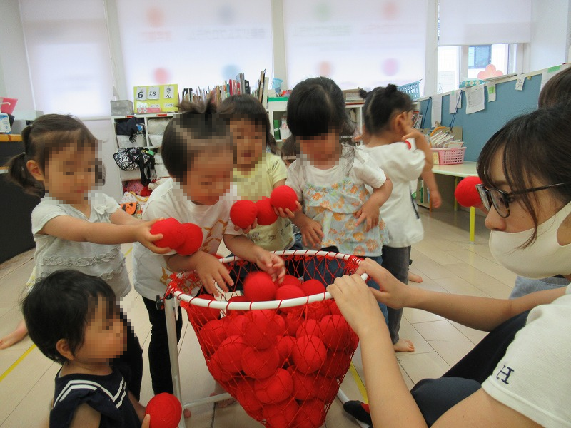 この日は玉入れ遊びをしました。ちょっと早いけど運動会の練習にもなりますし(笑)