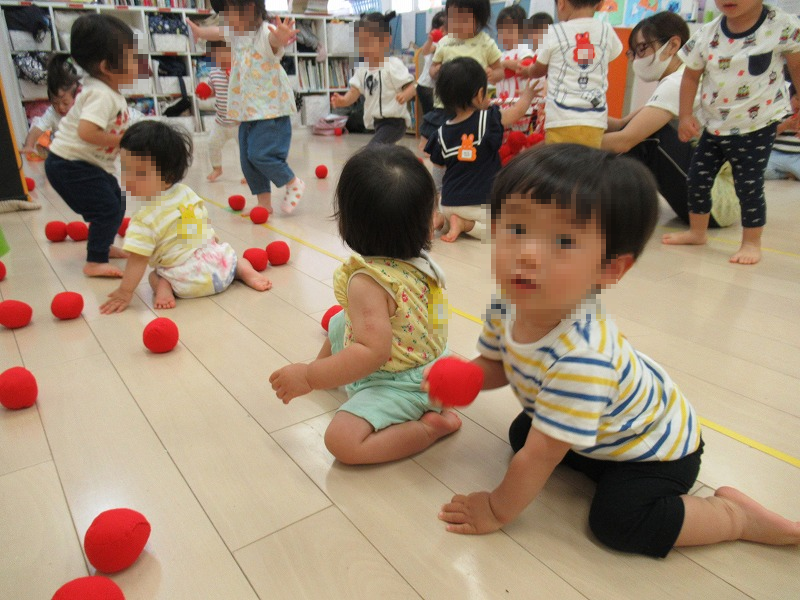 赤組(2才児)さんの真似をしてオレンジ・黄組(1,0才児)さんも楽しんでいます。みんなーがんばれー(^o^)/